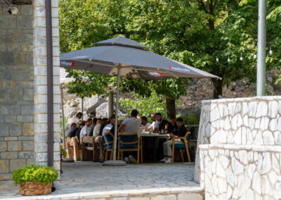 Idę się przejść po tej wiosce. Z jednej restauracji dobiega muzyka, jakiś lokalny albański pop. Jest głośno. Podchodzę, a tam długi stół, a przy nim z 50-u mężczyzn. Sami faceci. Głównie młodzi. Jedynie na szczycie stołu siedzi jeden starszy gość. Przed restauracją stoją same niezłe fury, oczywiście głównie Mercedesy. Nic jak jakiś zlot lokalnego kółka miłośników układania puzzli. Nagrywam ich z ukrycia. Potem się śmiejemy, że jakby się zorientowali co robię, to ekipa by straciła i busa i swojego safety car driver’a. Przepadłbym zapewne bez wieści i tyle by mnie świat widział.