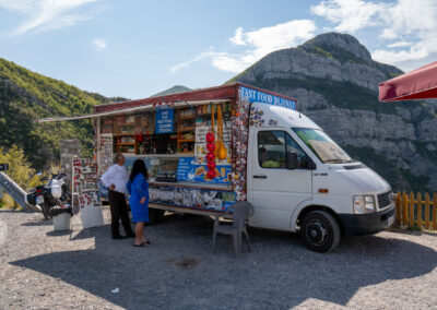 Jadę dalej. Trafiam na wjazd na przełęcz. Kilkanaście ostrych zakrętów i nachylenie 10%. Pnę się w górę. Mój Bus trochę jęczy, ale daje radę. Na górze wita mnie piękny widok na panoramę doliny i gór po drugiej stronie. Jest tam też food-truck. Jest cały oblepiony naklejkami. Szkoda, że my nie mamy swoich naklejek – może to pomysł na następne wyprawy? Leci albańska muzyka. Goście piją piwo i głośno się z czegoś śmieją. Podróżni zatrzymują się na chwilę i podziwiają widoki. Kupuję tutaj magnes do naszej kolekcji.