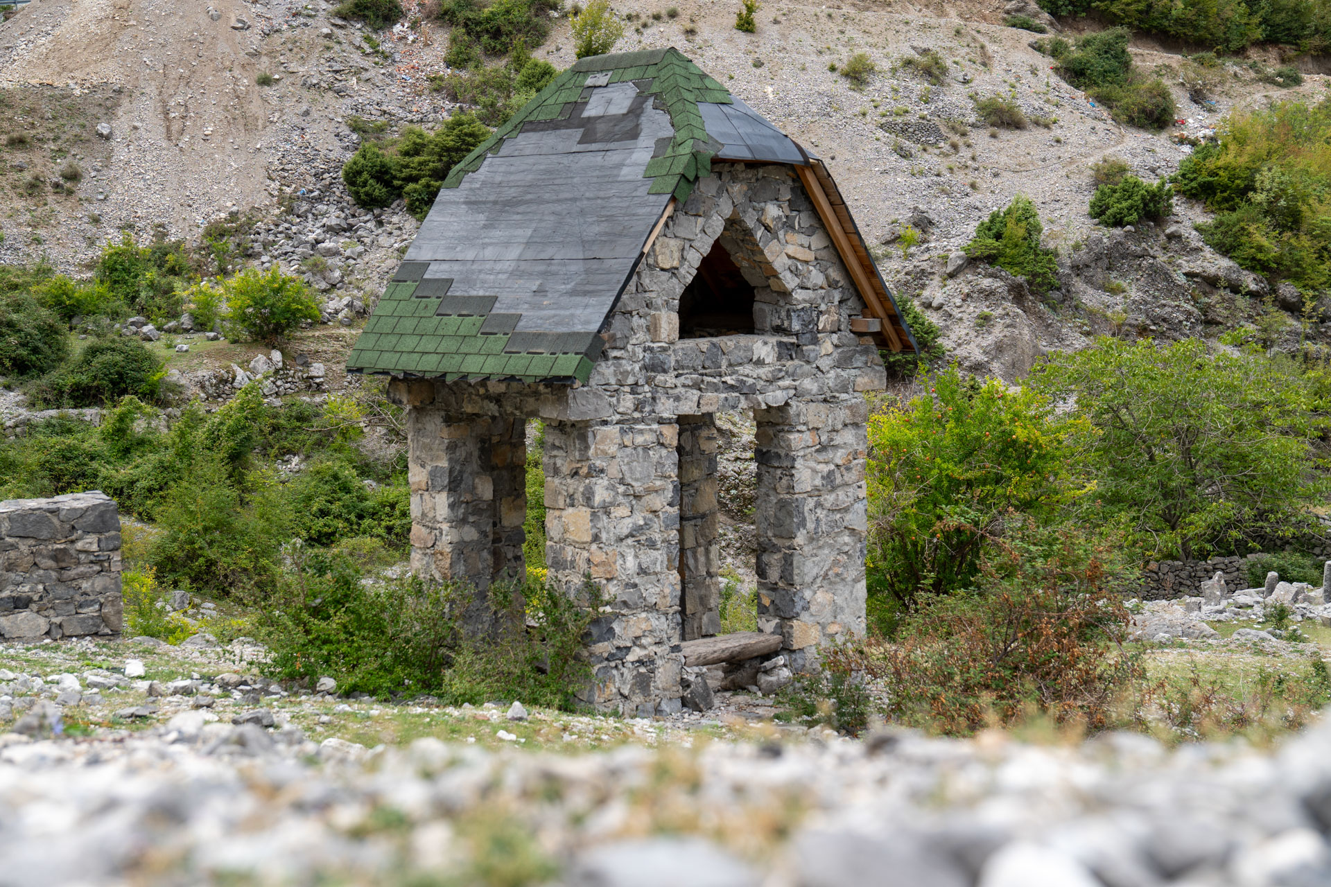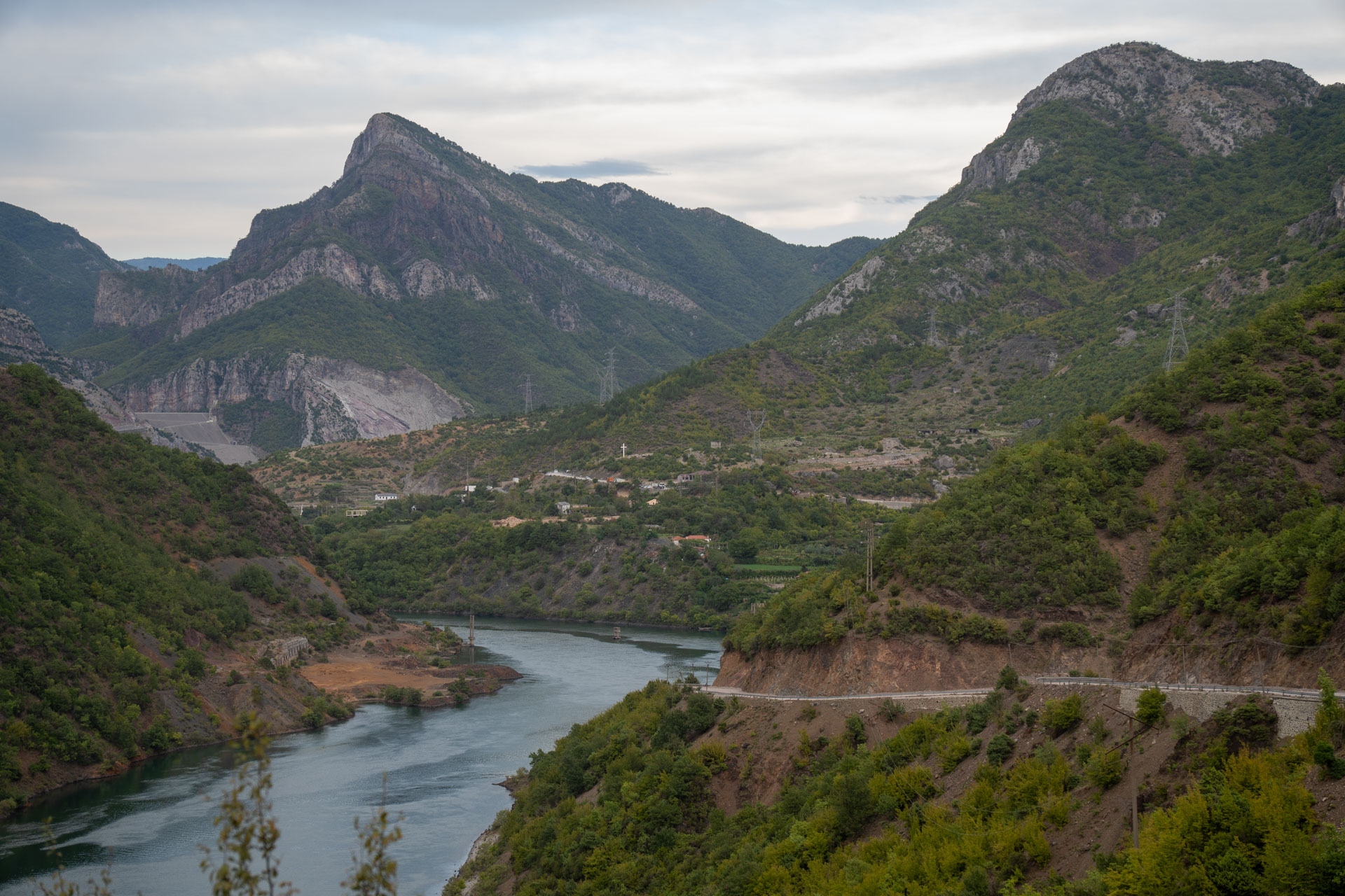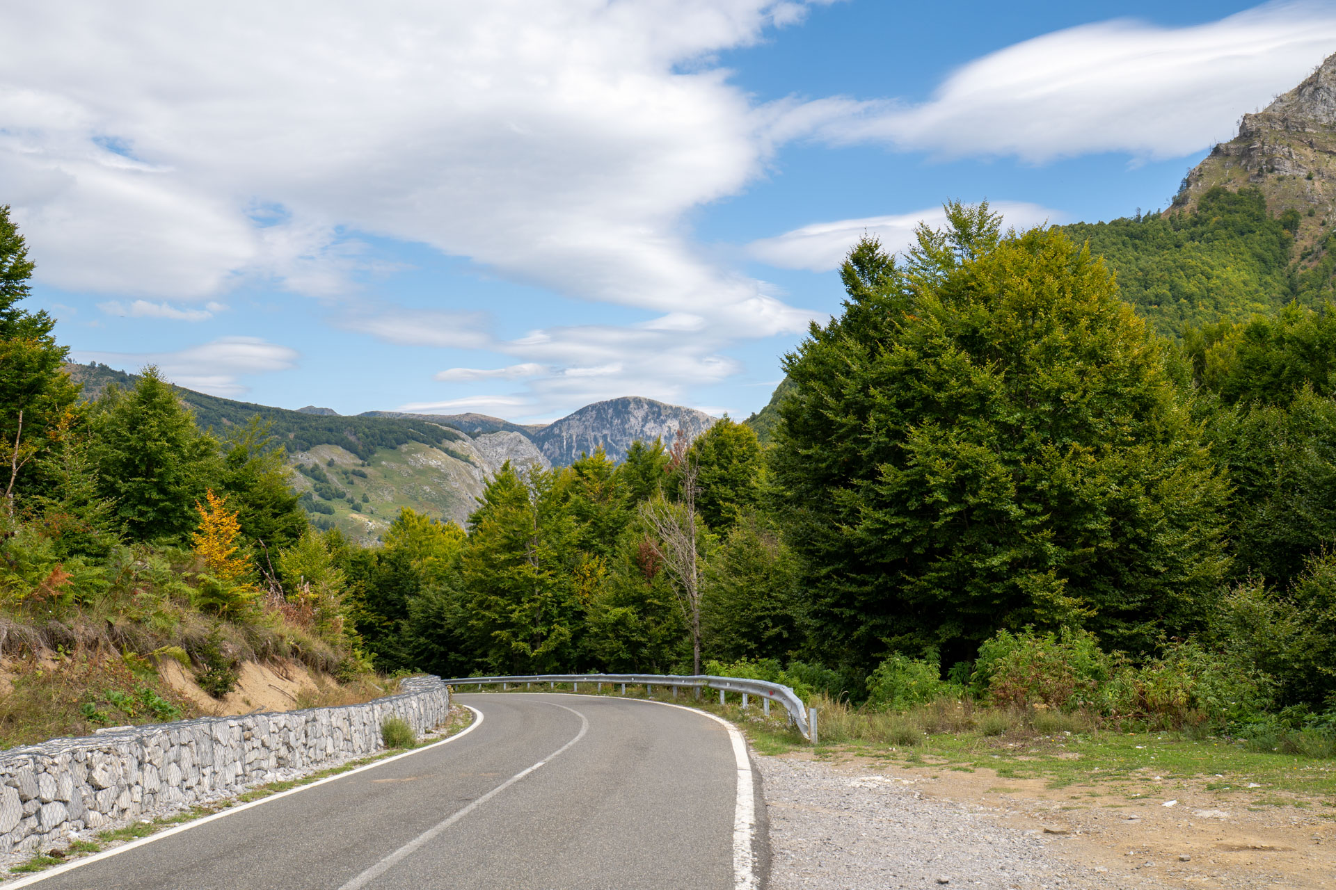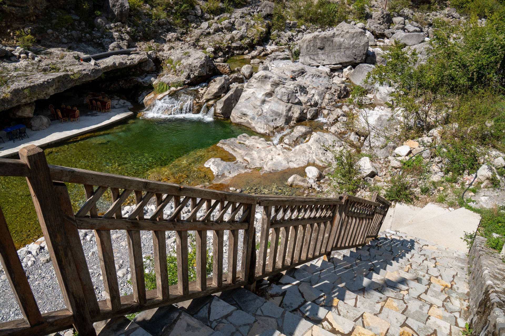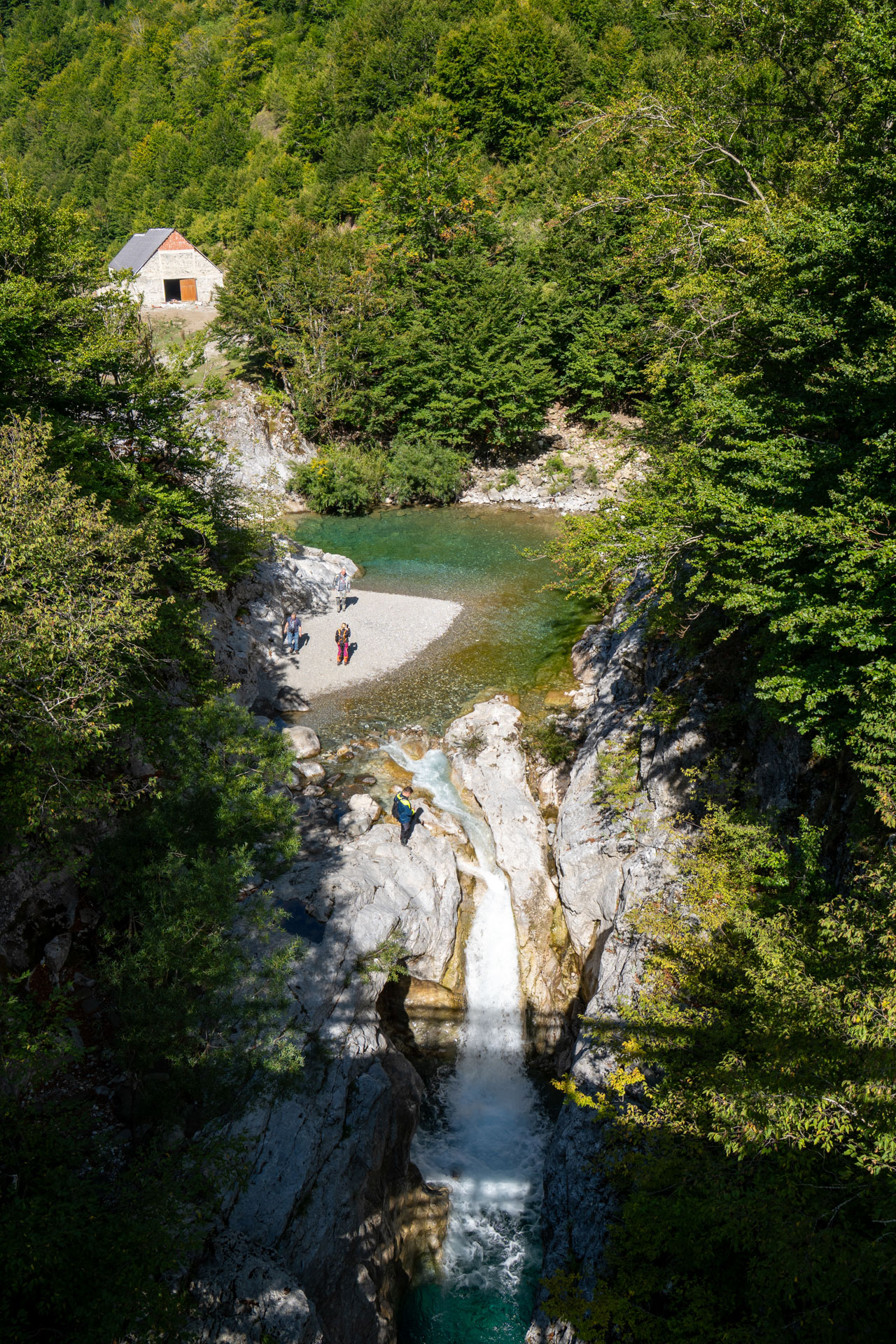 Albania wita nas pięknym wodospadem z jakimiś starymi zabudowaniami. Prawdziwy rwący górski potok huczy pięknie błękitną wodą. Rozbija się o białe skały i niknie w głębokim jarze. Nad nim wąski most, taki drewniany. Wszystko w scenerii wysokich postrzępionych szczytów albańskich alp i bujnej roślinności. Tutaj jeszcze jest lato. Wszystko jest zielone. Na jesienne kolory trzeba jeszcze poczekać.