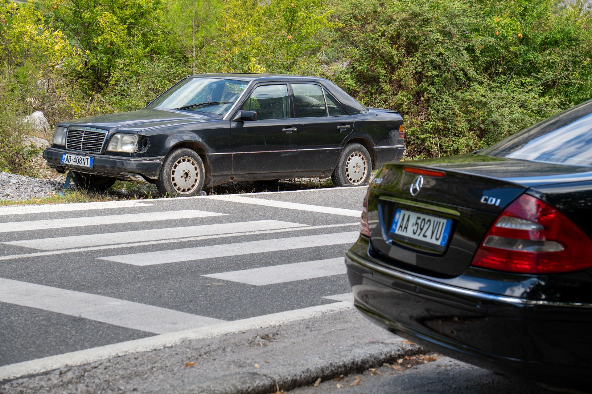 A po niej śmigają lokalne Mercedesy. Jak Serbia stała Golfami, tak w Albanii królują Mercedesy. Stare, młode, każdego koloru i wielkości. To niesamowite. Jakby to był jakiś film promocyjny Mercedesa. Przejeżdżam przez małą wioskę. Mała kawiarnia przy drodze. Na tarasie siedzi czterech gości. Przed budynkiem stoi Golf i trzy Mercedesy. Taki widoczek mijam tu co chwila.