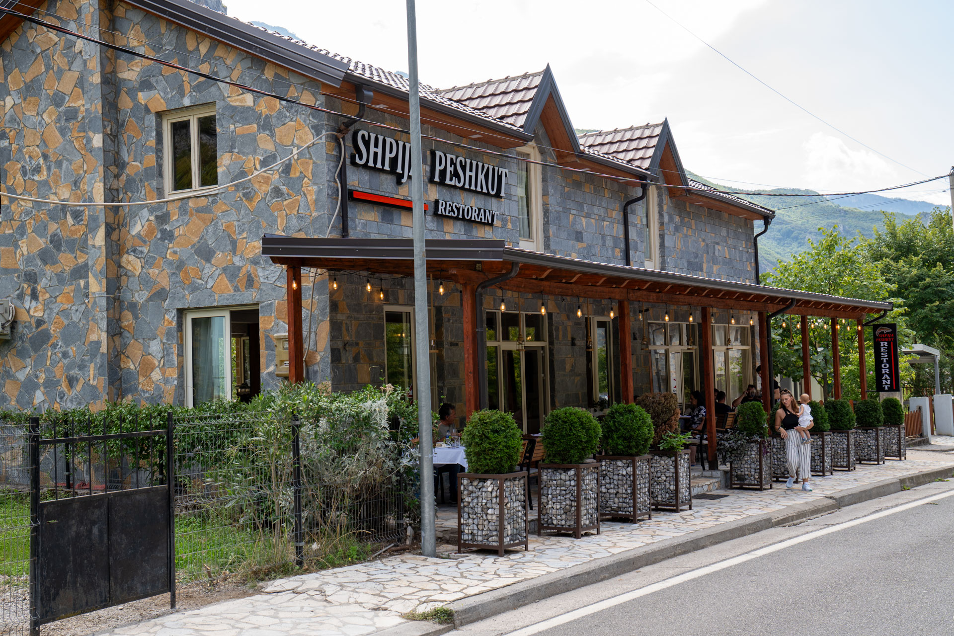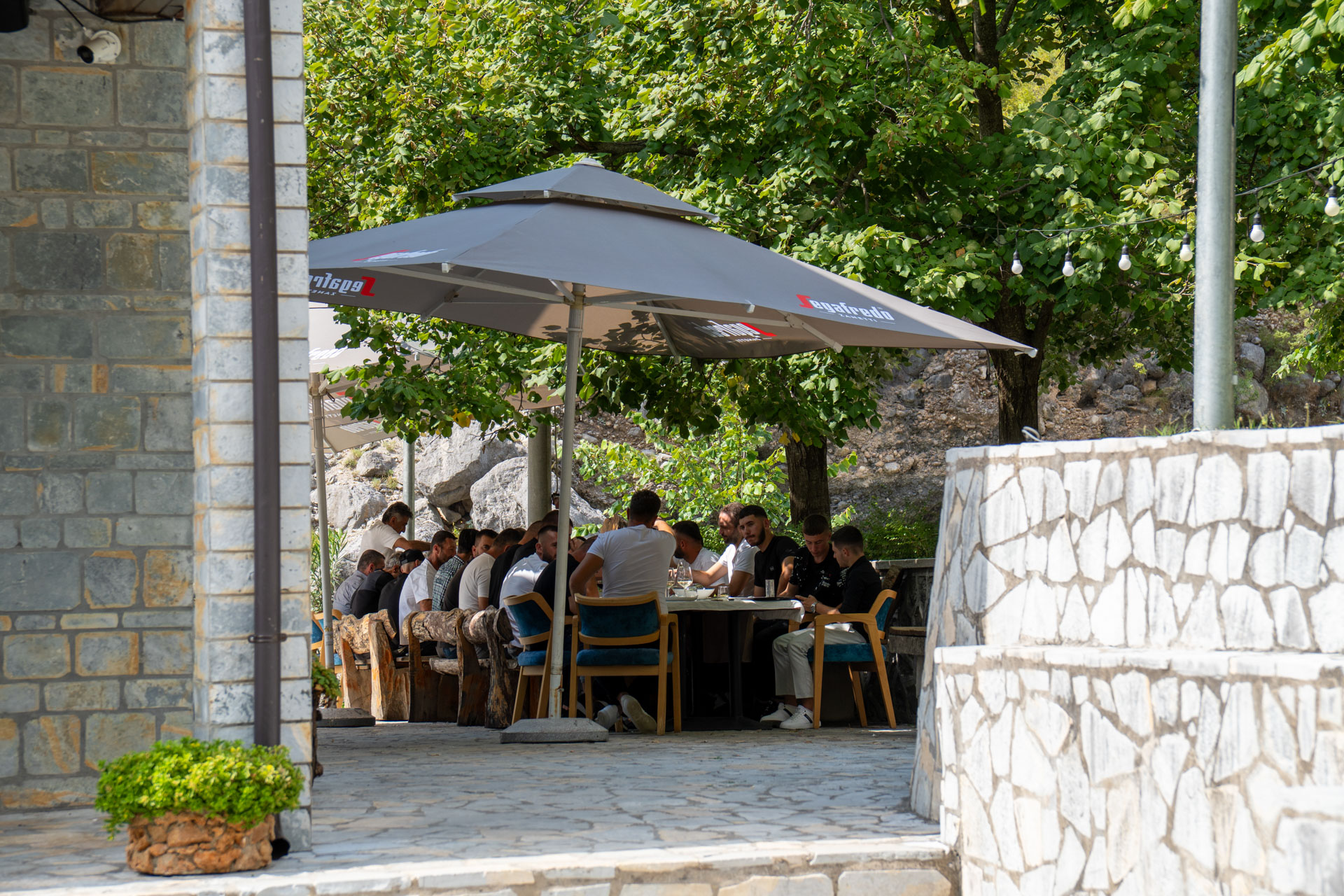 Idę się przejść po tej wiosce. Z jednej restauracji dobiega muzyka, jakiś lokalny albański pop. Jest głośno. Podchodzę, a tam długi stół, a przy nim z 50-u mężczyzn. Sami faceci. Głównie młodzi. Jedynie na szczycie stołu siedzi jeden starszy gość. Przed restauracją stoją same niezłe fury, oczywiście głównie Mercedesy. Nic jak jakiś zlot lokalnego kółka miłośników układania puzzli. Nagrywam ich z ukrycia. Potem się śmiejemy, że jakby się zorientowali co robię, to ekipa by straciła i busa i swojego safety car driver’a. Przepadłbym zapewne bez wieści i tyle by mnie świat widział.