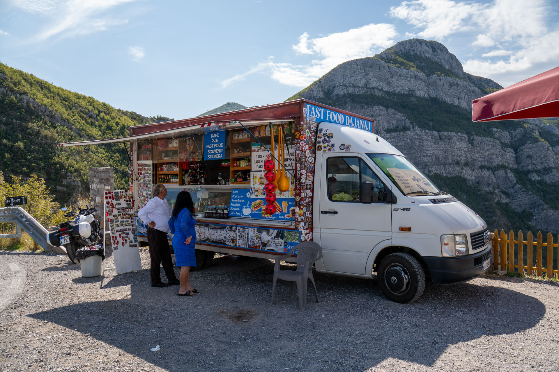 Jadę dalej. Trafiam na wjazd na przełęcz. Kilkanaście ostrych zakrętów i nachylenie 10%. Pnę się w górę. Mój Bus trochę jęczy, ale daje radę. Na górze wita mnie piękny widok na panoramę doliny i gór po drugiej stronie. Jest tam też food-truck. Jest cały oblepiony naklejkami. Szkoda, że my nie mamy swoich naklejek – może to pomysł na następne wyprawy? Leci albańska muzyka. Goście piją piwo i głośno się z czegoś śmieją. Podróżni zatrzymują się na chwilę i podziwiają widoki. Kupuję tutaj magnes do naszej kolekcji.