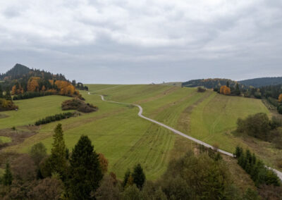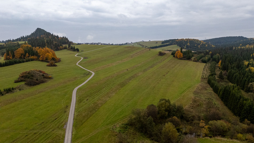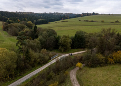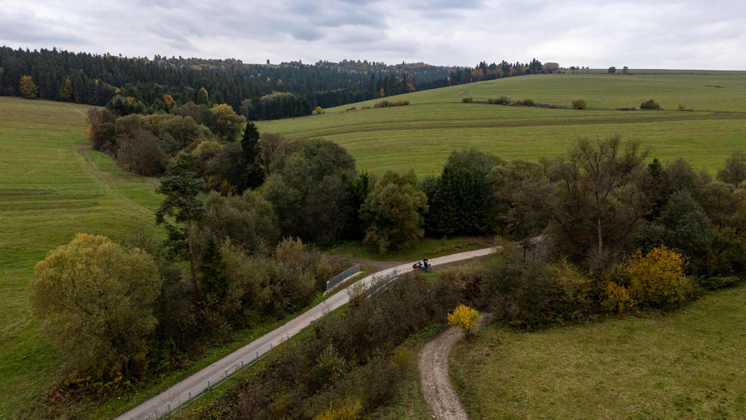 Ścieżka rowerowa prowadzi przez pola i doliny, raz w górę, raz w dół.