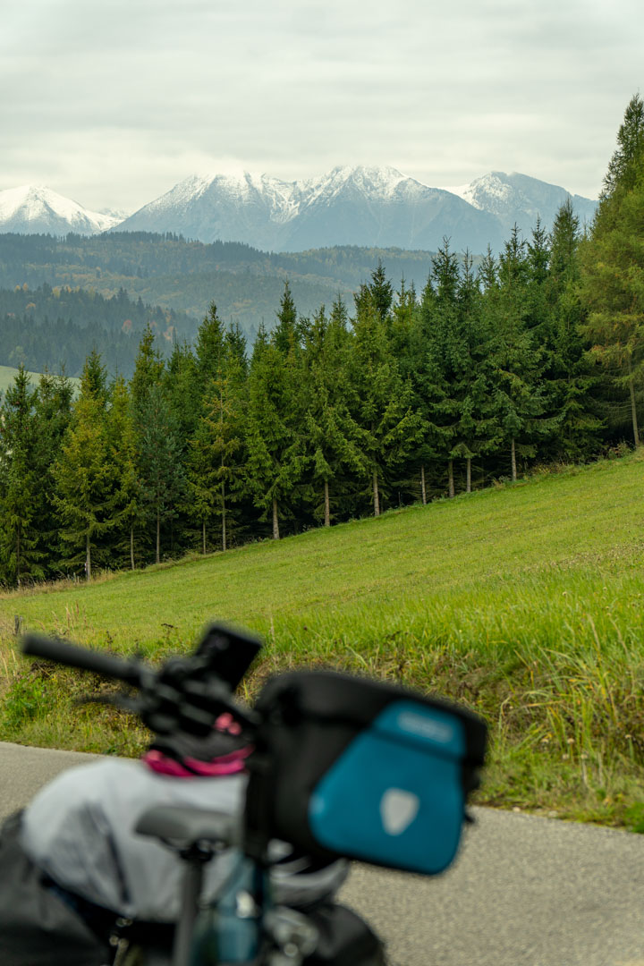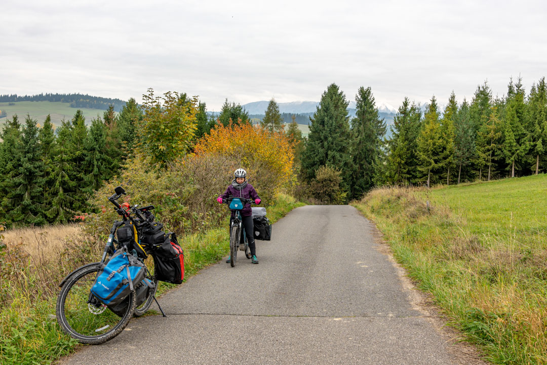 Cztery sakwy, torba na kierownicy, bagażnik, i ja — cały ten pakiet wjeżdża na najwyższy punkt Szlaku Wokół Tatr – 1180 m n.p.m.